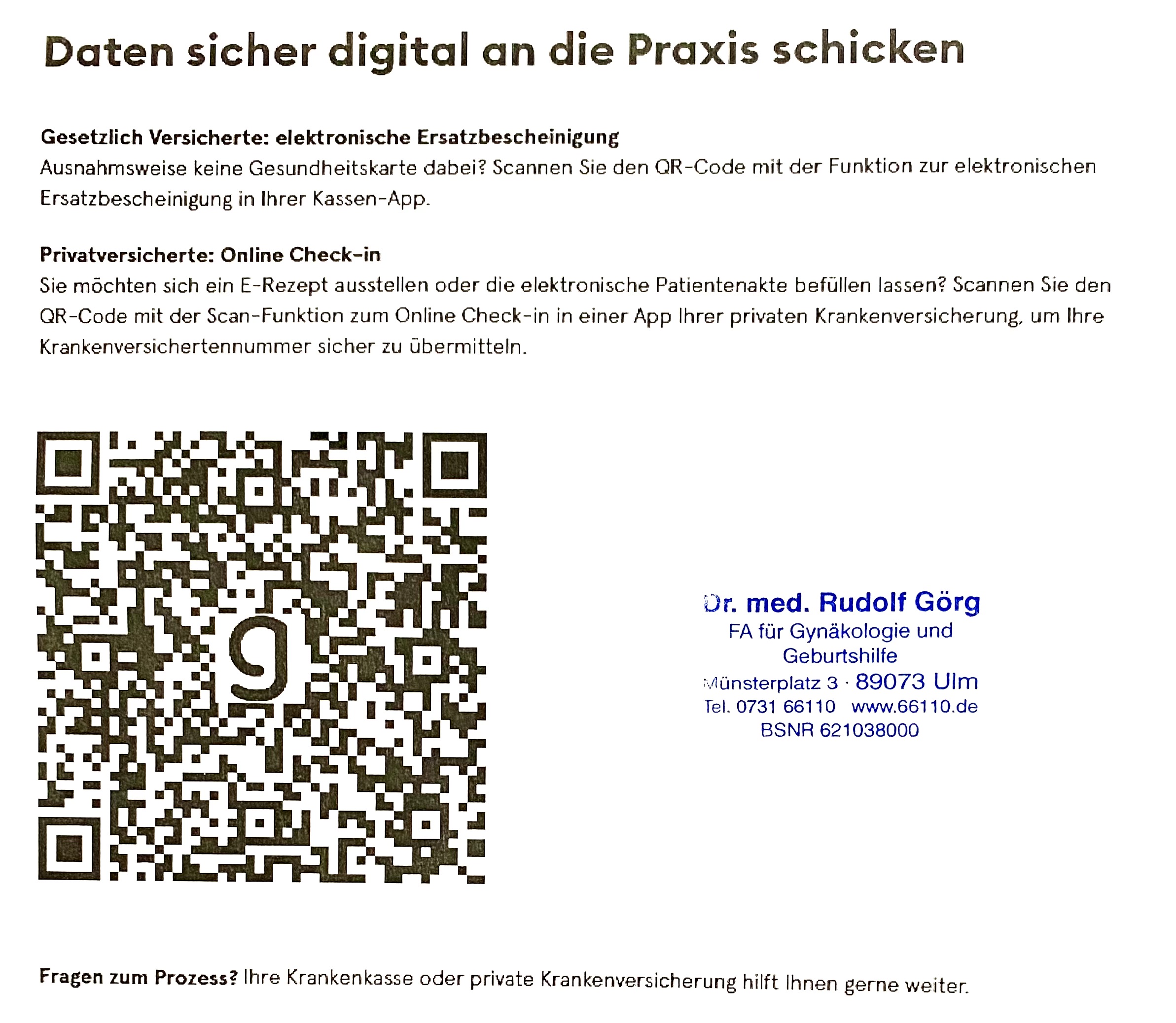 Sie haben aktuell keine gültige Versichertenkarte: Scannen Sie den QR Code in Ihrer App der Krankenversicherung und veranlassen Sie dadurch die digitale Zusendung einer Versicherungsbestätigung seitens Ihrer Krankenversicherung an unsere Praxis